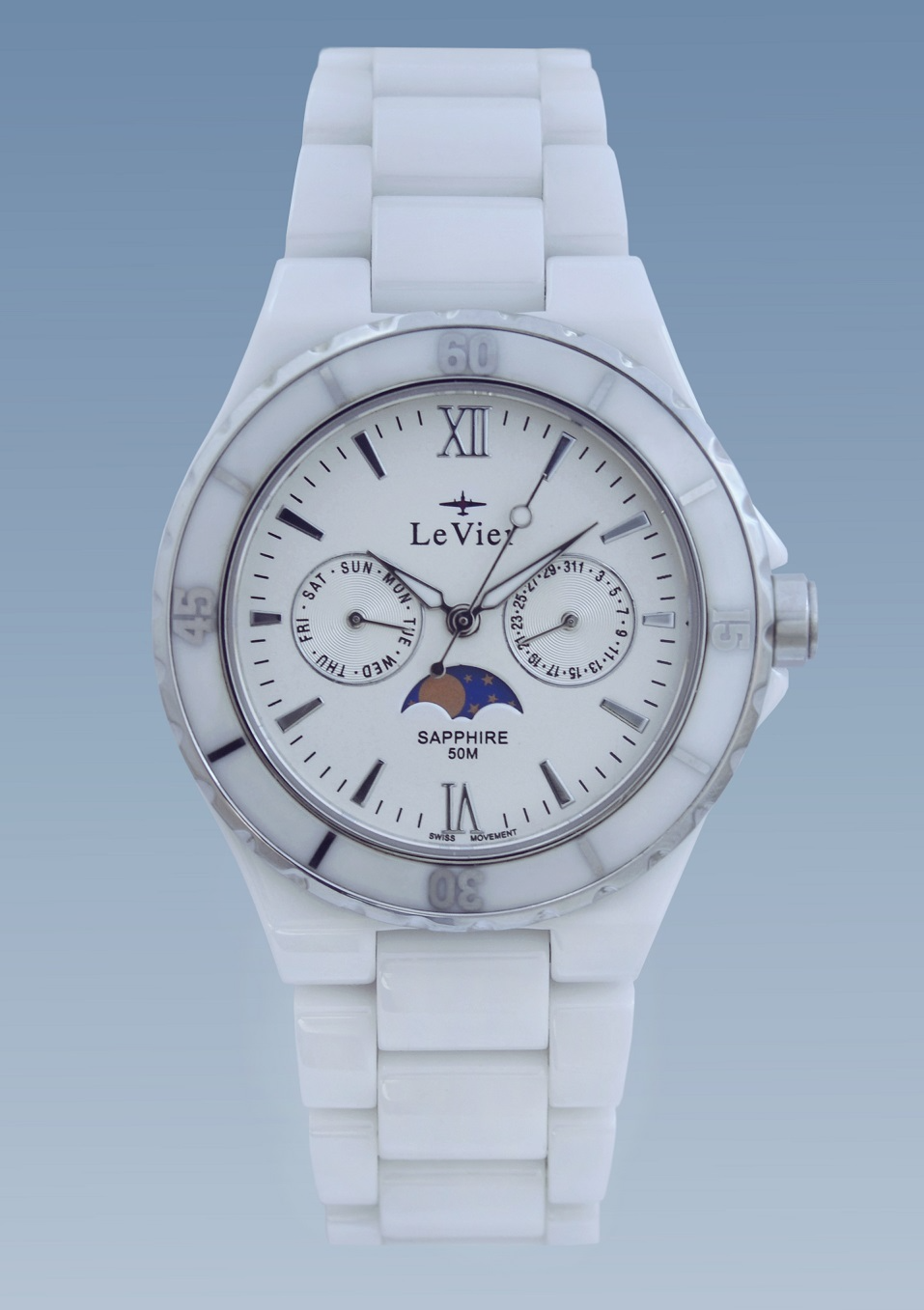 Бренд LeVier Страна производства Франция Пол мужские Вес без упаковки 136 Стекло Сапфировое Материал корпуса Керамика Механизм кварцевый Цвет циферблата белый Материал ремешка/браслета Керамика Форма часов круглая Секундная стрелка центральная Тип вставки отсутствует Индикация метки Цвет корпуса белый Диаметр корпуса 40 Гарантия 2 года доп функции фазы луны, лунный календарь